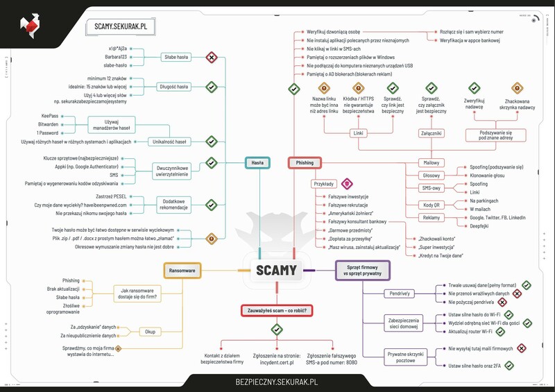 Zespół serwisu internetowego SECURAK.PL zajmującego się bezpieczeństwem w sieci przygotował plakat, który w bardzo dobry, skondensowany sposób przedstawił problem oszustw internetowych w formie plakatu, który możemy Państwu udostępnić. Autorzy plakatu zawarli skondensowaną wiedzę o oszustwach w sieci w formie mapy, aby w prosty sposób można było analizować zagrożenia.