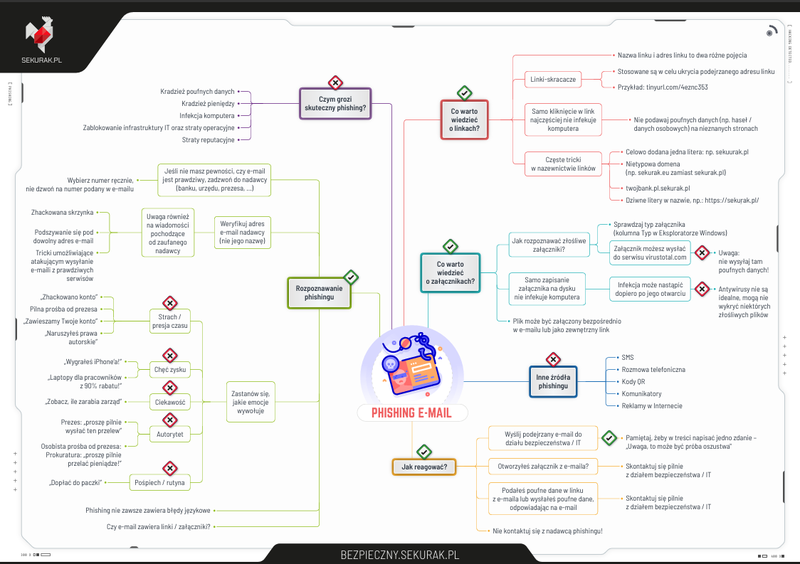 Zespół serwisu internetowego Sekurak.pl zajmującego się bezpieczeństwem w Internecie przygotował materiał edukacyjny dotyczący jednego z najczęściej występujących zagrożeń w sieci, jakim jest phishing. Przygotowany plakat w przejrzystej, graficznej formie przedstawia najważniejsze informacje o tym, jak rozpoznawać próby wyłudzenia danych oraz jak reagować w przypadku podejrzanych wiadomości.
